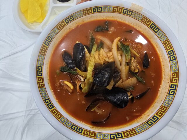 주문한 짬뽕이 테이블 위에 놓이자, 세종에서 온 벗의 눈이 휘둥그레졌다. 눈앞에 놓인 그릇은 그 자체로 풍성함의 상징이었다. 짙고 붉은 국물 위로 검은 빛깔의 홍합이 산처럼 쌓여 있고, 그 사이로 불에 그을린 양파와 배추, 그리고 오징어가 존재감을 드러낸다.