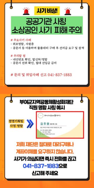 재단 측은 “우리 재단은 어떠한 경우에도 소상공인에게 물품 대리구매나 계좌이체를 요구하지 않는다”라고 강조했다. 전화로 구매 요청을 받을 경우 반드시 해당 직원의 재직 여부를 확인해야 하며, 사기가 의심되면 즉시 전화를 끊고 재단 대표번호(041-837-1883)로 신고해야 한다.
